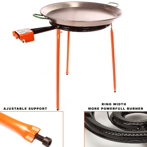 Paella tradizionale fissato per 8 o 10 porzioni come piatto unico o da 10 a 12 porzioni di 80/100 g per persona.Caratteristiche del set Paella ValencianaLa padella che comprende il set di paella messures 60 cm di diametro e ha due manici. E 'realizzato in acciaio lucido per Vaello Campos SL, uno dei maggior parte dei produttori di Valencia. Questo tipo di padella paella raggiunge un grande gusto tradizionale della paella, per questo, anche se richiede manutenzione e la manutenzione, il pi utilizzato da noi valenciani.Il bruciatore a gas paella incluso nel set, di largo anello, ed dotata di un nuovo sistema di ottimizzazione consumatore che realizza una combustione pi nobile e potenza di bruciatori circolari paella anello. Essa ha anche toccare di rete con un modulo ago che mai gli zoccoli, e il buco si trova negli anelli sono inclinati di 45 gradi per evitare l'intasamento, quindi questo prodotto durer molto di pi di paella di minore portata. Chiedi migliore controllo della fiamma sia massima e minima. Questo bruciatore paella di due anelli indipendenti di grandi dimensioni con le valvole per regolare la fiamma. Forniamo il bruciatore paella adattato agli standard di collegamento del Regno Unito ed approvato per cucinare all'aperto.Con questo masterizzatore potete cucinare paella da 30 a 70 cm di diametro.Il set che si pu prendere ora per la vostra casa, comprende anche un kit di gambe robuste di 72 cm di altezza. Oltre ad essere i pi alti del mercato, sono l'unica regolabile in altezza, che indispensabile per voi pu livellare l'olio in diversi tipi di superfici. Questo uno dei primi passi e pi importanti per avviare la corretta preparazione di questo piatto cos internazionale.Prima del primo utilizzo:Per rimuovere facilmente l'etichetta, scaldando leggermente il fondo della padella. Si evitare di danneggiare l'aspetto del prodotto prima dell'uso. Far bollire l'acqua nella ciotola, lavare con acqua e detergente.